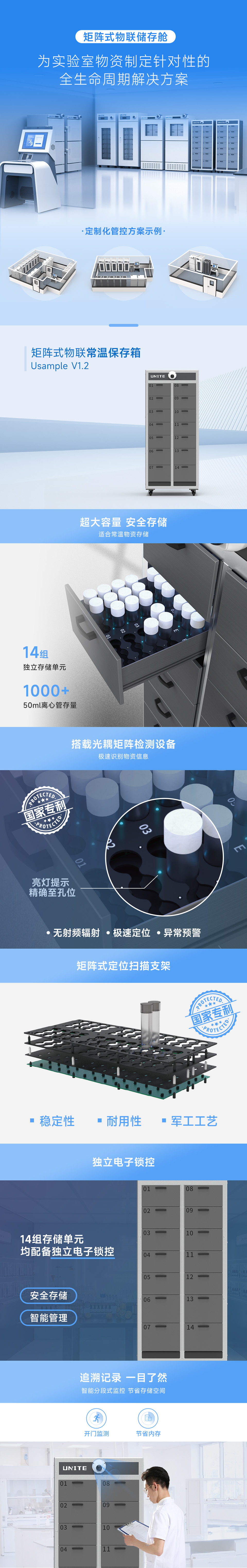 優納特Usample V1.2矩陣式物聯常溫保存箱,搭載光耦矩陣檢測設備,內置14組獨立電子鎖控存儲單元。