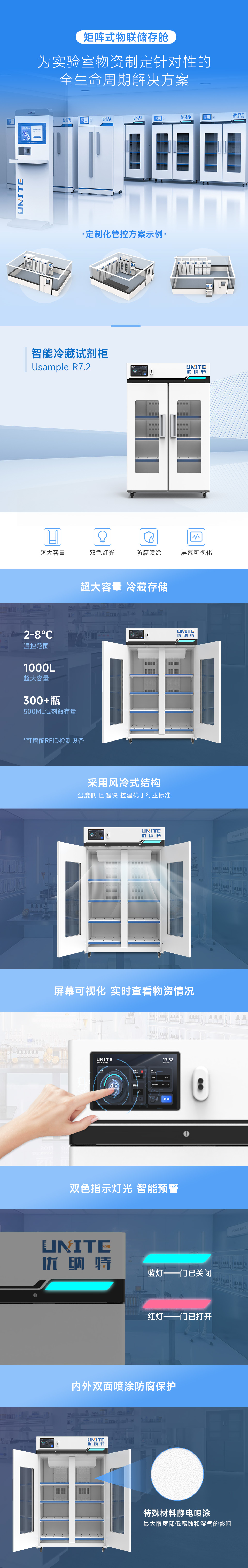 智能冷藏試劑柜精準控溫2-8℃,雙層鋼化電加熱玻璃門,獨立安全門鎖設計。全生命周期監控出入庫操作、統計。配備五重報警、四重保護,全面保證樣本/試劑信息與使用安全。