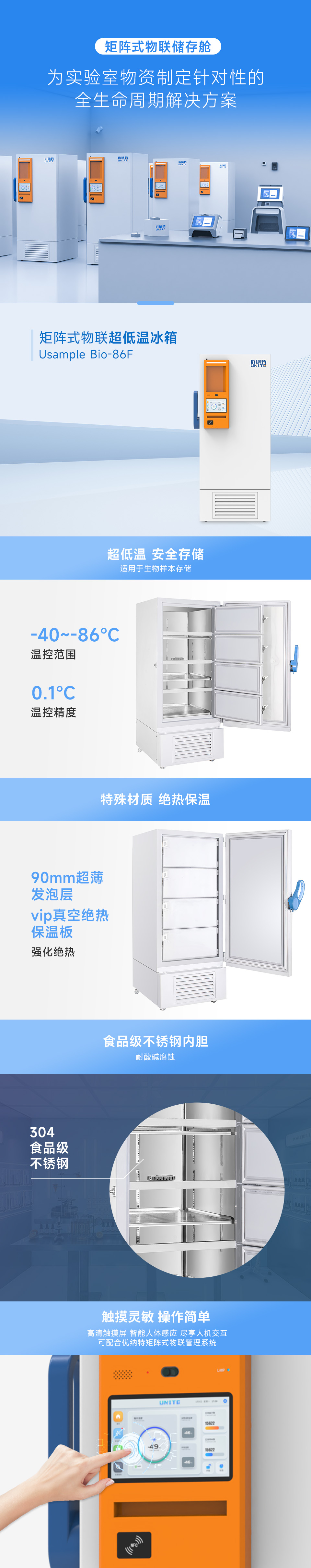 -86 矩陣式物聯超低溫冰箱精準控溫-40 — -86℃,304不銹鋼內膽食品級安全材質,耐酸堿腐蝕,儲存更安全;觸摸顯示屏顯示系統運行狀態與庫存情況,隨時進行事件、報警、信息查詢。配備五重報警、四重保護,全面保證樣本信息與使用安全。